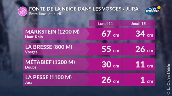 Après les fortes chutes de neige du week-end dernier dans les Vosges et le Jura, la fonte des neiges est marquée depuis le début de semaine avec le vent de sud qui souffle sur les crêtes et les températures largement positives. Au Markstein dans les Vosges, l'épaisseur de neige est passée de 67 cm lundi à 34 cm ce jeudi. A la Pesse à 1100 m dans le Jura, le manteau neigeux a quasiment disparu avec le vent de sud qui souffle depuis le début de la semaine et les températures largement positives.