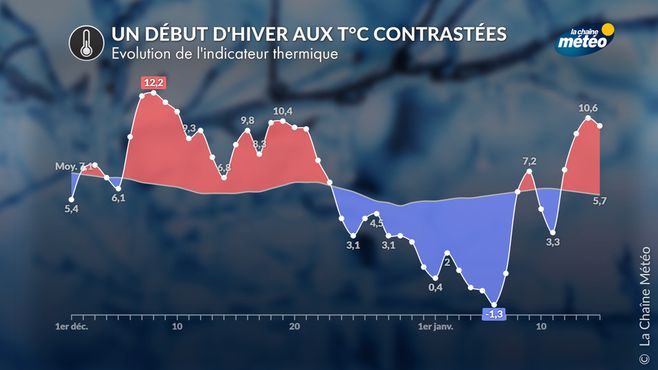 C'est un début d'hiver météorologique (1er décembre au 15 janvier) aux températures très fluctuantes, avec une période de grande douceur du 5 au 20 décembre suivie de 3 semaines de froid entre la période de Noël et le 10 janvier. Un net redoux s'est opéré à la mi-janvier. Sur cette première partie d'hiver, la température moyenne à l'échelle nationale présente un faible excédent de +0,6°C.
