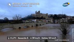 La situation reste préoccupante en Roussillon et sur l'est de la Corse en fin de journée où les fortes pluies persistent, faisant craindre des crues de rivières et des inondations dans les plaines littorales. Le vent, toujours proche de 90 km/h sur les côtes, maintient un risque élevé de submersion marine. En montagne, les conditions restent difficiles avec un véritable blizzard. Du centre au nord et à l’est du pays, le temps demeure calme sous un ciel souvent nuageux.