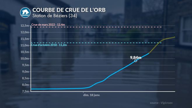 À 10 h 30, l'Orb qui traverse la ville de Béziers subit une crue importante. Le fleuve de l'Orb dépasse ce dimanche 18 janvier au matin la marque enregistrée lors de la crue de 2018 et s'approche du niveau de celle de 2022 (2,90 m). La préfecture de l'Hérault a ouvert une cellule de crise, alors que le département est placé en vigilance orange.
