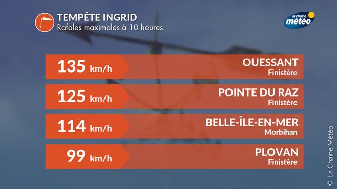 A 08h17 : la dépression INGRID se situe à 300 km à l'ouest de Brest par 955hPa. Elle a entrainé un premier épisode de vent violent en milieu de nuit avec des rafales tempétueuses sur le littoral du Finistère et les îles. A 2h du matin, une rafale à 136 km/h a été enregistrée au sémaphore de Ouessant (29), 119 km/h à Belle-île-en-mer (56), 112 km/h sur l'île de Groix (56), 109 km/h à la pointe du Raz (29). Dans les terres, une rafale a été observée à 95 km/h à Plovan dans le Finistère.