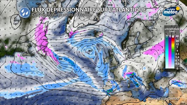 La #vaguedefoid américaine propulse de l'air froid sur l'Atlantique, formant des dépressions. Celles-ci se dirigent ensuite vers l'Europe de l'Ouest, avec un défilé de pluies Effet des vases communicants ! pic.twitter.com/NMouDZVNsU