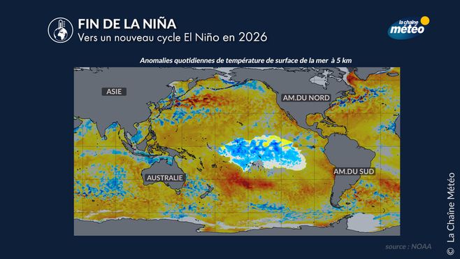 Après une La Niña faible ces derniers mois, les anomalies de température de surface du Pacifique équatorial se rapprochent progressivement de la neutralité. Les centres de prévision envisagent ensuite une probabilité croissante d’El Niño à partir de la seconde partie de 2026, avec un signal potentiellement plus net durant l’hiver 2026-2027. Cela pourrait avoir des répercussions sur le niveau mondial des températures.