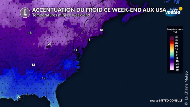 La vague de #froid américaine va s'intensifier à nouveau ce week-end avec la plongée du #gel jusqu'en #Floride : -7°C attendus à Pensacola, risque de gel à Miami, près de -20°C à #NewYork, des valeurs proches des records pic.twitter.com/hqLdsTHzKc