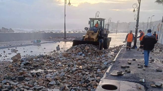 Au Maroc, les précipitations se concentrent sur le nord : sur 48 heures, Tanger a relevé 142 mm, Chefchaouen 111 mm et Larache 76 mm, avec des débordements localisés et des évacuations signalées dans certains secteurs sensibles. La mer est démontée sur le littoral, provoquant des submersions. Le littoral méditerranéen n'a pas été épargné par la tempête, où le front de mer d'Alger (Algérie) a été en partie détruit par les vagues (notre photo).