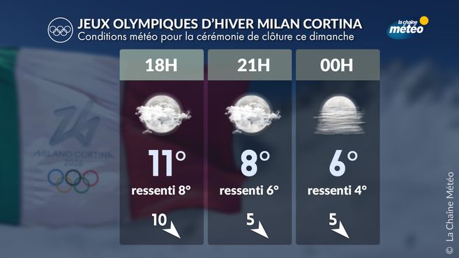 La cérémonie de clôture va se dérouler à l'arène de Vérone, dimanche, à 20h, pour une durée d'environ 3h. Les conditions seront typiquement fraîches et hivernales, avec un ciel clair, et des températures comprises généralement entre environ 6 et 11°C