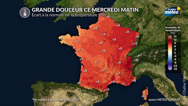 Ce pic de douceur s'explique par une arrivée d'air subtropical dans le secteur chaud d'une perturbation atlantique circulant dans un rapide flux de secteur sud-ouest. C'est surtout au lever du jour que les températures s'annoncent remarquablement douces, avec des températures au lever du jour déjà supérieures à celles qu'on devrait enregistrer l'après-midi. La carte ci-dessous montre que l'excédent de température sera compris entre +7 et +10°C sur la plupart des régions.