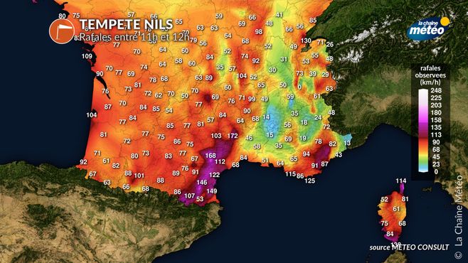 Tempête Nils : rafales maximales observées © La Chaine Météo