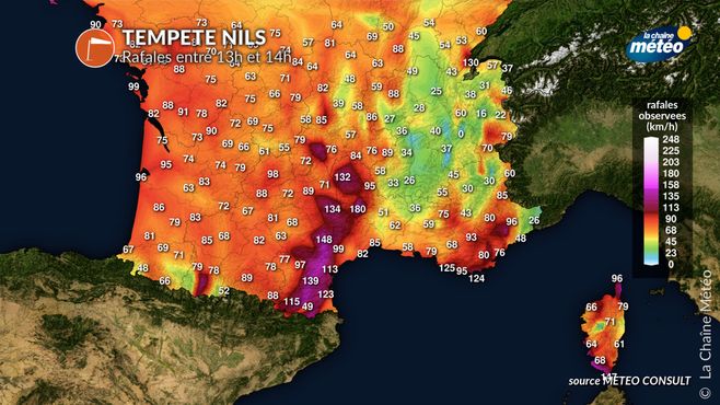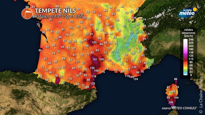 Tempête Nils : rafales maximales observées © La Chaine Météo