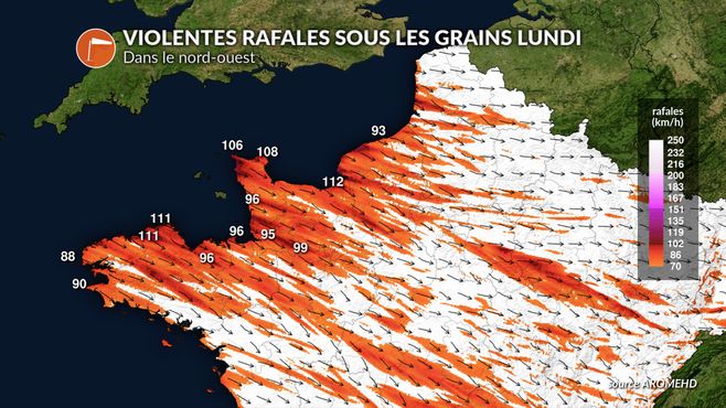 - des rafales de 60 à 80 km/h, jusqu’à 100 km/h sous les grains orageux en bord de mer