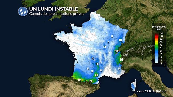 Le temps est instable sur la quasi-totalité du pays. Les averses les plus fortes, parfois accompagnées de quelques coups de tonnerre, concernent surtout les régions proches de la Manche ainsi que le sud de la Garonne. En montagne, la neige tombe abondamment au-dessus de 800 à 1700 mètres, des Vosges aux Alpes aux Pyrénées. Cette situation augmente le risque d’avalanche. Près de la Méditerranée, le ciel est menaçant avec un vent sensible.