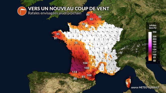 Les modèles météo offrent des prévisions similaires concernant les régions les plus exposées. Notre modèle ensembliste METEOCONSULT prévoit des rafales très fortes, surtout sur l'axe Atlantique - Méditerranée, avec des vents pouvant dépasser les 100 km/h.