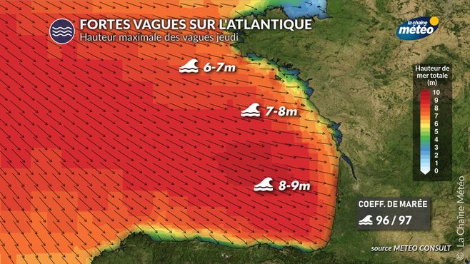 Côté mer, la situation est préoccupante sur l’Atlantique : la houle pourra atteindre 8 à 9 mètres au large de l’Aquitaine, dans un contexte défavorable de coefficients de marée très élevés (jusqu’à 97). Cette combinaison augmente nettement le risque de submersion marine, en particulier sur les secteurs côtiers sensibles.