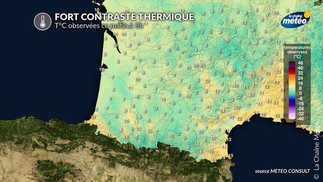 En ce mardi matin, le contraste thermique est très important dans le sud-ouest, si bien qu'il atteint 17°C entre la forêt des Landes et le pays basque.