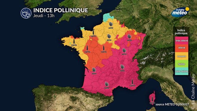 La douceur printanière favorise la dispersion des pollens en France. Les régions Auvergne-Rhône-Alpes, Corse, Nouvelle-Aquitaine, Occitanie et Provence-Alpes-Côte d'Azur sont particulièrement touchées, avec des niveaux élevés de pollen de cyprès et d'aulne. Pour limiter les symptômes allergiques, avec un risque accru pour les personnes sensibles aux cyprès, platanes et aulnes, d'autant plus avec la douceur qui s'annonce pour cette semaine.