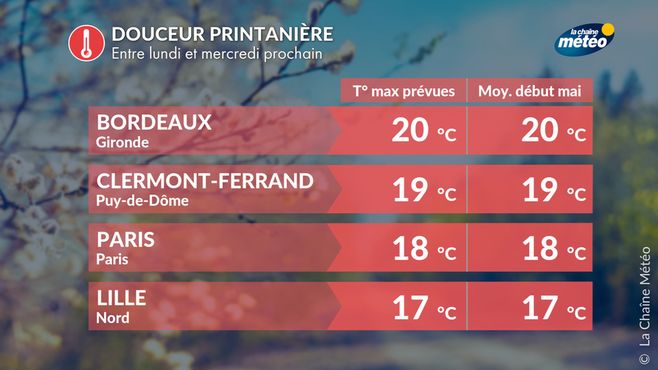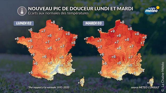 Ainsi, mardi et mercredi prochains, on se situera 7 à 10°C au-dessus des normales de saison.