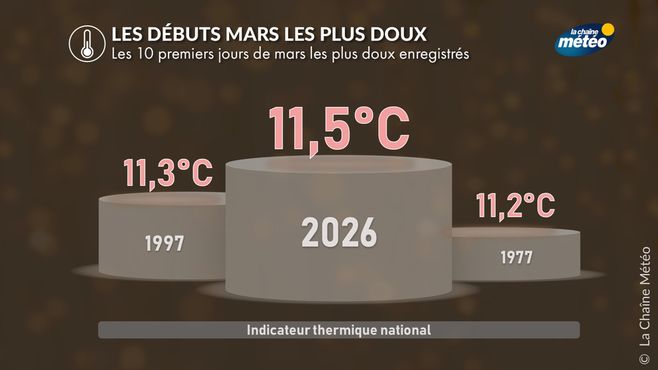 Cette dynamique se traduit par un début de mois de mars particulièrement remarquable. Les températures se situent souvent très au-dessus des normales saisonnières et l’indicateur thermique national atteint des niveaux records. Les dix premiers jours de mars figurent déjà parmi les plus doux jamais observés depuis le début des relevés voire potentiellement le plus doux.