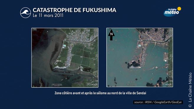Le sol s'est abaissé de 0,5m ce qui a accentué d'autant plus certaines submersions côtières © La Chaîne Météo / IRSN / GoogleEarth/GeoEye