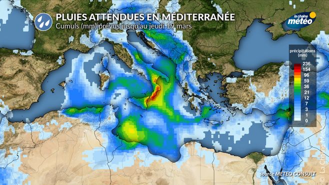 Pluies attendues en Méditerranée jusqu'au jeudi 19 mars © La Chaine Météo / Météo Consult