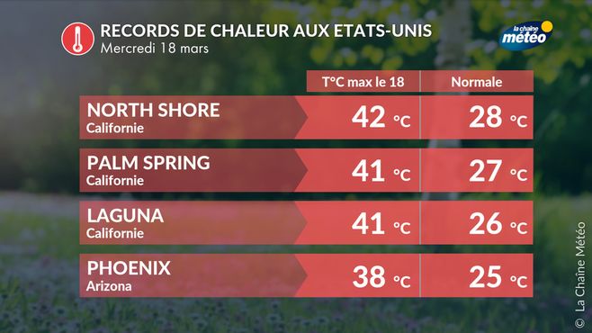 Dans les zones les plus exposées du sud de la Californie et de l'Arizona, les températures dépassent la barre des 40°C, avec des pointes attendues à 43°C. Les premiers records de chaleur ont été pulvérisés mercredi avec 41°C à Palm Spring (Californie) et 38°C à Phoenix où l'on a enregistré les premiers 100°Fahrenheit les plus précoces jamais observés. De nombreux records de chaleur seront battus d'ici le week-end, avec même des records de chaleur d'avril qui pourraient tomber.