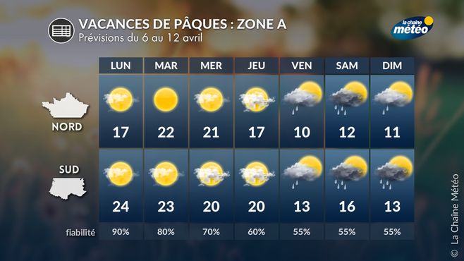 La première semaine des vacances de Pâques pour la zone A, du 6 au 12 avril, s’annonce contrastée. Elle débute par un véritable pic de douceur, voire de chaleur au sud-ouest, avant une dégradation possible en seconde partie de semaine, avec un retour de la pluie et une baisse des températures encore à confirmer.