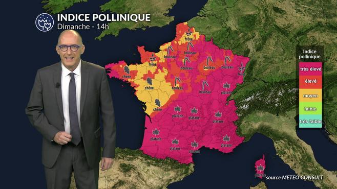 Pour ce dimanche de Pâques, l'indice pollinique est maximal sur les 3/4 du pays à la faveur des belles éclaircies. En revanche, l'indice pollinique est modéré du centre-ouest jusqu'au bassin parisien, grâce aux nuages qui vont limiter la dissémination des pollens.