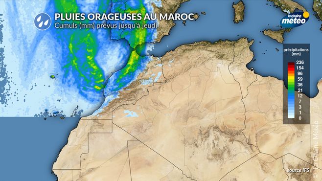 Au Portugal, c'est surtout dans la journée de mardi que ces fortes pluies vont s'abattre. On attend globalement 40 à 100 mm en 48h sur le pays. Localement, sur les reliefs exposés, des cumuls supérieurs à 100 mm sont possibles. Par la suite, entre la soirée de mardi et jusque dans la journée de jeudi, ces fortes pluies orageuses se décalent vers l'ouest et le sud de l'Espagne. Localement, des cumuls de l'ordre de 100 à 150 mm peuvent être relevés en Andalousie. Enfin, au Maroc, des pointes jusqu'à 100 voire 120 mm peuvent ainsi être observées jusqu'à jeudi, notamment sur la côte ouest du pays ainsi que dans la région de Tanger-Tétouan.