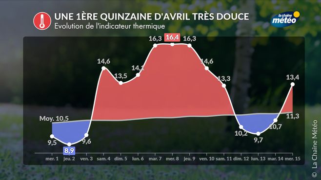 Avec une anomalie thermique de +1,9°C par rapport aux normales 1991-2020, cette première quinzaine d’avril 2026 a été très douce et se classe en 13ème position des débuts avril les plus doux depuis un siècle.