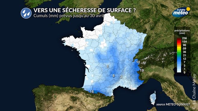 Malgré un hiver très pluvieux ayant bien rechargé les nappes phréatiques, le début du printemps est devenu nettement plus sec. En raison du déficit de précipitations, les sols superficiels commencent à s'assécher, surtout sur la moitié nord. Si le temps sec et anticyclonique persiste, la sécheresse de surface pourrait bien s'amplifier dans les jours et semaines à venir.