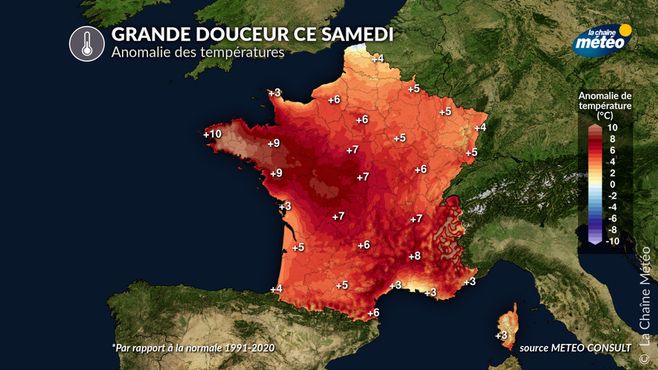 Les températures maximales de ce samedi se situent 4 à 6°C au-dessus des normales de saison du sud-ouest au nord-est. En Bretagne, l'écart à la normale atteint +9 à +10°C.