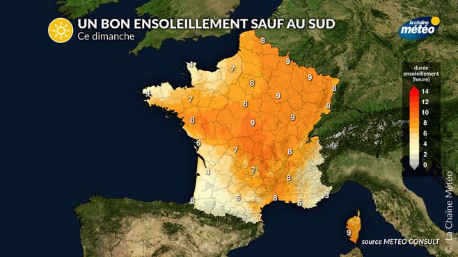 L'après-midi, les températures sont sans grand changement par rapport à samedi, souvent comprises entre 22 et 24°C l'après-midi du nord au sud. On reste 5 à 7°C au-dessus des normales de saison, un niveau de mi-juin. C'est entre la Bretagne et le Massif central jusqu'au Languedoc que l'excédent de température est le plus important (10°C au-dessus des normales). On attend 24°C à Brest, 25°C à Nantes, Bordeaux et Toulouse, jusqu'à 26°C à Montpellier.