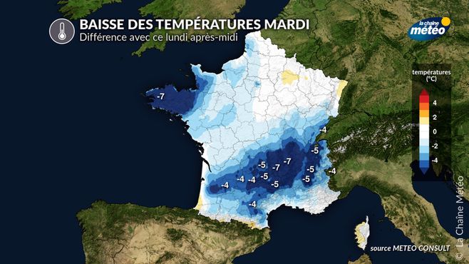 Baisse des températures prévue mardi par rapport à ce lundi après-midi © La Chaine Météo