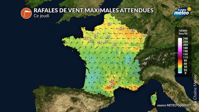 Rafales de vent maximales prévues ce jeudi © Meteo Consult / La Chaine Météo