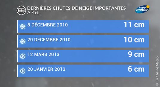 Des chutes de neige se sont produites hier soir dans Paris. La couche a atteint 1 à 2 cm. Il faut remonter au mois de mars 2013 pour retrouver les dernières ...