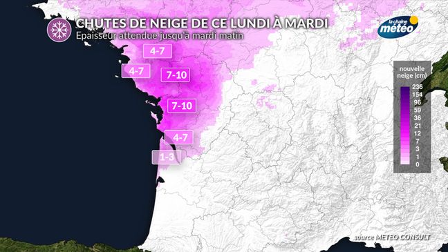 La perturbation s'annonce active sur les Pays de la Loire et le nord de la Nouvelle-Aquitaine en fin de journée avec 4 à 7 cm de neige sur le pays nantais et 7-10 cm entre l'intérieur de la Vendée, les Deux-Sèvres et la Charente-Maritime. A Voir plus ...