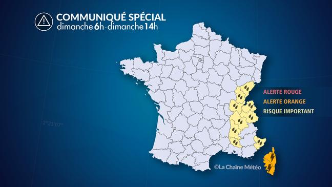 Ce dimanche, le mauvais temps s'attarde encore en matinée du Jura aux Alpes à la Corse avant une amélioration attendue dans l'après-midi. On attend encore de fortes intensités pluviométriques sous les cellules orageuses les plus actives avec un risque de ruissellement important étant donné les sols très secs. Des inondations peuvent se produire près des points bas et à proximité des cours d'eau. Dans le même temps, la plongée d'air froid en Méditerranée provoque le creusement d'une dépression sur le golfe de Gênes à 995 hPa. Cette dépression très creuse engendre de forts vents d'ouest à près de 100 km/h au large de la Provence et sur l'ouest de la Corse, avec une mer agitée à forte, ce qui rend les conditions de navigation dangereuses en mer..