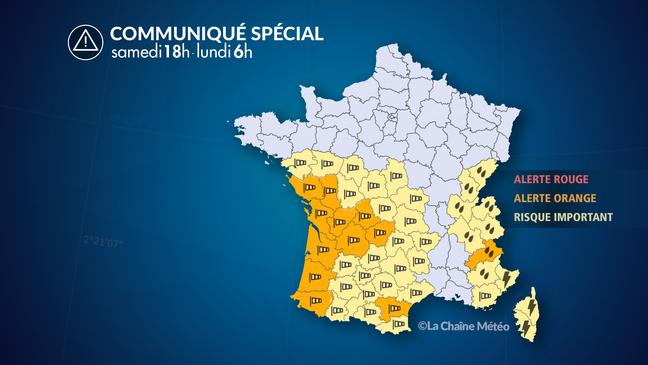 Parallèlement à ces vents violents, des pluies abondantes se produisent, essentiellement sur les reliefs exposés au vent d'Ouest (Jura, Alpes du Nord et l'ouest du Massif central et des Pyrénées) avec 100 à 150mm d'eau, équivalant à 1 mois de pluie en 48 heures. Ces pluies abondantes s'accompagnent d'un risque modéré de réaction de cours d'eau avec quelques débordements possibles. A noter également de forts orages de l'arrière-pays varois à la Corse dimanche, suivis d'un violent coup de vent dans la nuit de dimanche à lundi.