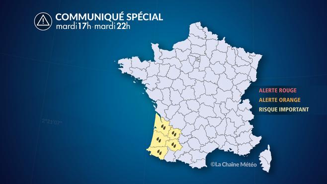 La tendance pour la soirée de ce mardi est à la persistance d'un temps agité et pluvieux sur ces mêmes régions. Les pluies ont même tendance à être plus soutenues sur la Nouvelle-Aquitaine, tandis que la limite pluie-neige s'abaisse vers 1400 m sur les Pyrénées. Les vents sont à nouveau plus forts sur la côte aquitaine, pouvant atteindre 100 km/h de secteur ouest à nord-ouest. La mer reste très forte.