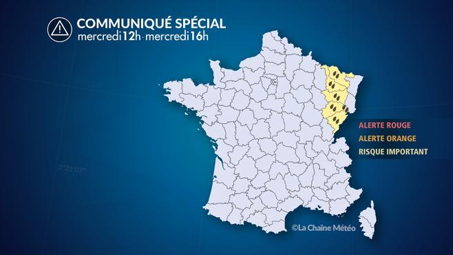Après les fortes pluies orageuses tombées la nuit dernière en Franche-Comté (jusqu'à 104 mm à Brannes dans le Doubs) avec quelques inondations observées dans le secteur, la Lorraine et notamment le département des Vosges subit des pluies intenses de puis quelques heures. Entre 9h et 15h on a observé 31 mm à Epinal (88), 37 mm à Roville (88) et 57 mm à Dommartin-aux-Bois (88). En 24 heures les plus gros cumuls de pluie atteignent 45 mm à Epinal, 65 mm à Dommartin-aux-Bois et 70 mm au Val d'Ajol, ce qui correspond à 3 semaines de pluie. On observe aussi 68 mm à Bonneville en Haute-Savoie et 56 mm à Belfahy en Haute-Saône.