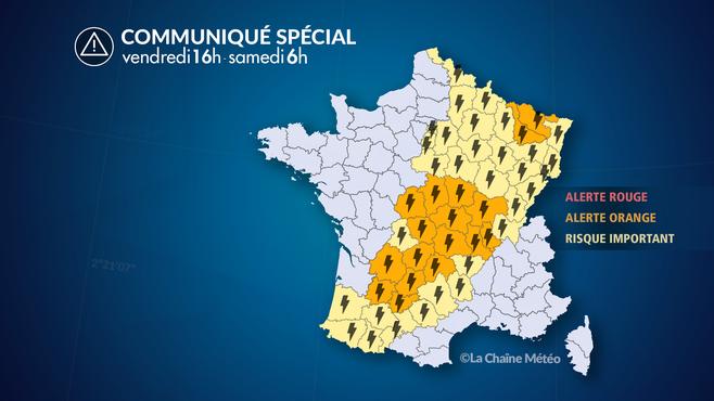 Ce soir, une nouvelle dégradation orageuse s'étend des Pyrénées en remontant vers le Massif central au nord et au nord-est de la France, en passant par une partie de la région parisienne. C’est la période la plus critique de cette dégradation, une dégradation plus marquée que celle de jeudi soir car davantage généralisée et plus intense dans l’ensemble avec un fort risque de chutes de grêle et de brusques rafales de vent jusqu'à 90 m/h ainsi que d'intenses pluies avec 10 à 40 mm d'eau en l'espace d'1 heure seulement.