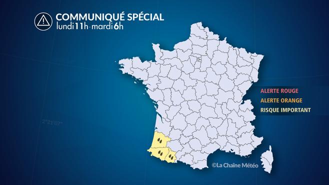 Cette nuit, les précipitations sont plus intermittentes dans l’ensemble, mais parfois fortes avec des orages sur le littoral. Le vent se renforce sur la côte pour atteindre localement les 120 km/h. A ce sujet, la côte espagnole cantabrique est placée en alerte de niveau rouge pour les fortes vagues (8 à 9 m dans le golfe de Gascogne), et en niveau orange pour les vents qui y souffleront un cran plus fort que sur le littoral français. Notons cependant que les seuils d'alerte différent selon les pays.
