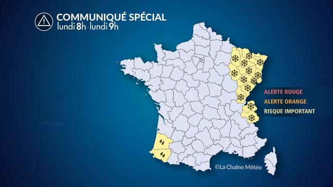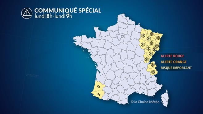 La perturbation arrivée dimanche matin par l'ouest atteint l'est du pays. Arrivant sur de l’air froid, elle génère un épisode modéré de neige sur les régions du Nord-Est et du Centre-Est jusqu'à lundi matin. Dans le sud-ouest, les pluies continues qui touchent principalement les Landes et les Pyrénées-Atlantiques augmentent fortement les risques d’inondations.