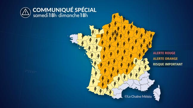 Dimanche, c'est au tour des régions de l'est d'être concernées par de forts orages, raison pour laquelle ce communiqué a été étendu dès ce samedi à 9h du Grand Est à la Franche-Comté et à Rhône-Alpes.