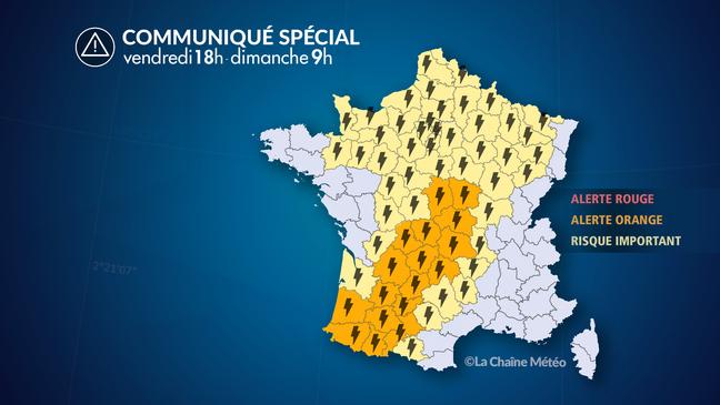 Nuit de samedi à dimanche : les violents orages qui ont touché le sud-ouest dans la soirée gagnent le Berry, le nord de l'Auvergne et la Bourgogne-Franche-Comté. Le risque de grêle et de fortes rafales de vent persiste au passage des orages. Des orages moins violents et plus localisés peuvent encore se produire du Bassin parisien aux frontières du nord.