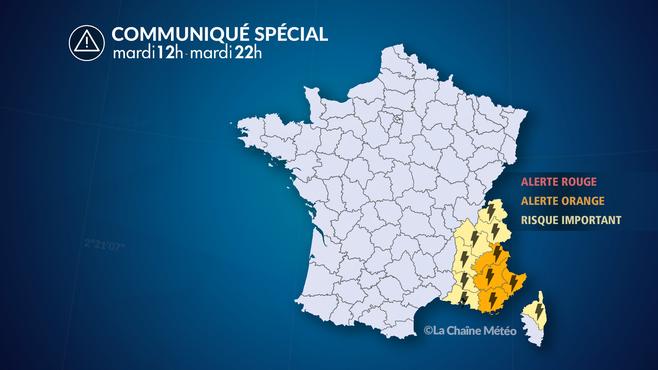 Attention, la dégradation sera brutale dès 14 h. Des orages se formeront rapidement en montagne, et surtout entre les Hautes-Alpes, l'intérieur du Var et la Côte d'Azur. Ne vous laissez pas surprendre. Il convient de limiter les déplacements en zones de relief et d'annuler les activités extérieures (canyoning, randonnée...) ainsi que les activités en bord de mer, qui ne seront pas épargnés. Le risque provient notamment des ruissellements, éboulements et crues subites des torrents de montagne, mais aussi des impacts de foudre. La grêle est redoutée, en particulier sur le Var et les Alpes-de-Haute-Provence.