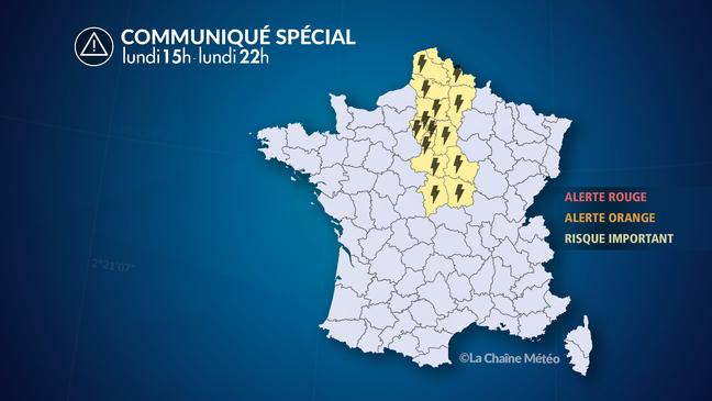 En soirée, ces orages parfois forts concernent l'Ile-de-France puis remontent en direction de la Picardie et du Nord-Pas-de-Calais avant de s'évacuer rapidement par la Belgique dans la nuit. Le communiqué spécial pourra être levé à 22 heures.