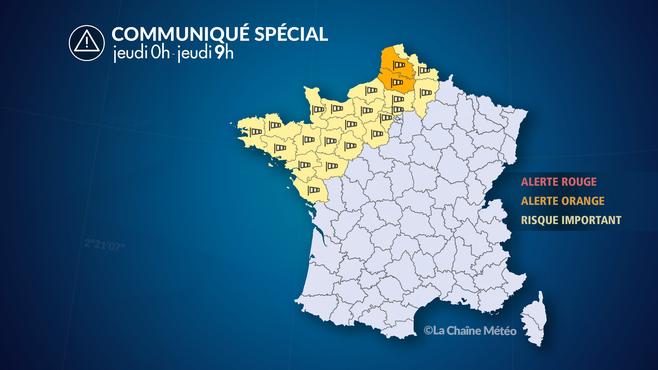 Cette nuit, le vent se renforce sur le nord de l'Ile-de-France et surtout sur la Haute-Normandie et les Hauts-de-France, et souffle en violentes rafales du Cotentin à la côte d’Opale en passant par la côte d’Albâtre. Les rafales atteignent de 90 à 100 km/h dans les terres et jusqu'à localement 110 à 120 km/h sur les côtes, localement 130 km/h sur les caps les plus exposé. Le vent perdra de l’intensité en Bretagne, avec des rafales se stabilisant entre 70 et 90 km/h sur les côtes.