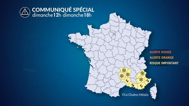 Cet après-midi, une nouvelle dégradation généralisée se produit au passage d'un nouveau front pluvio-orageux très actif entre l'est du Languedoc et des Cévennes vers la PACA et le sud des Alpes. En montagne, il neige fortement au-dessus de 1100 mètres sur l'est du Massif central et 1300 mètres sur le sud des Alpes. C'est en fin de soirée et milieu de nuit de dimanche à lundi, avec l'évacuation de la perturbation vers l'Italie et la Corse, que les conditions s'amélioreront et que ce communiqué spécial sera levé.