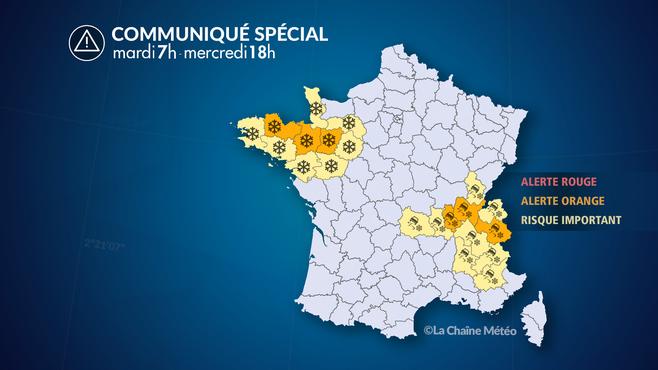 Ce communiqué sera étendu cet après-midi au bassin parisien jusqu'au Grand-Est en raison des chutes de neige et pluies verglaçantes prévues également sur ces régions.