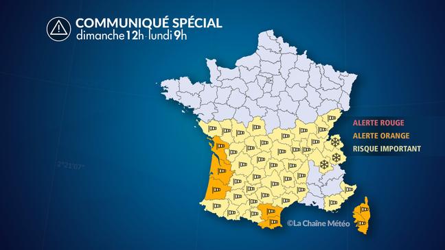 Une dépression très active traverse la France entre dimanche et lundi des côtes bretonnes à la Méditerranée. À son passage, elle provoque un fort coup de vent entre l'ouest et le sud de la France. Les rafales les plus fortes peuvent atteindre près de 90 km/h et localement 120 à 130 km/h en bord de mer ainsi qu'en montagne, avec des pointes tempétueuses ponctuellement 10 à 20 % supérieures au passage de puissantes lignes de grains orageux.